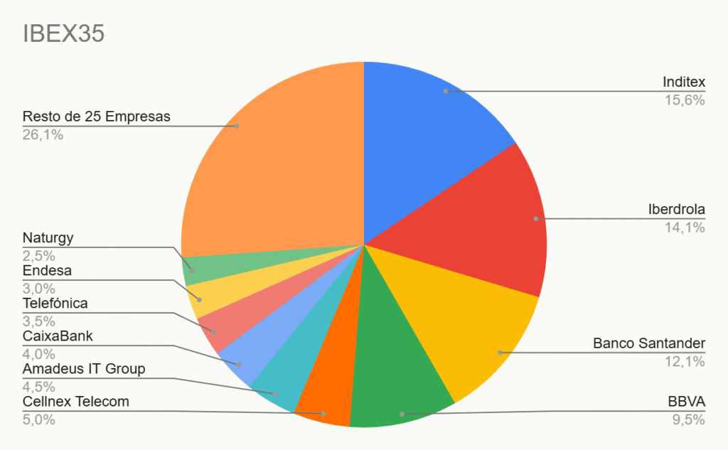 La gran mayoría de los índices que escuchas a diario, como el IBEX 35 español o el S&P 500 de Estados Unidos, son índices ponderados por capitalización bursátil.