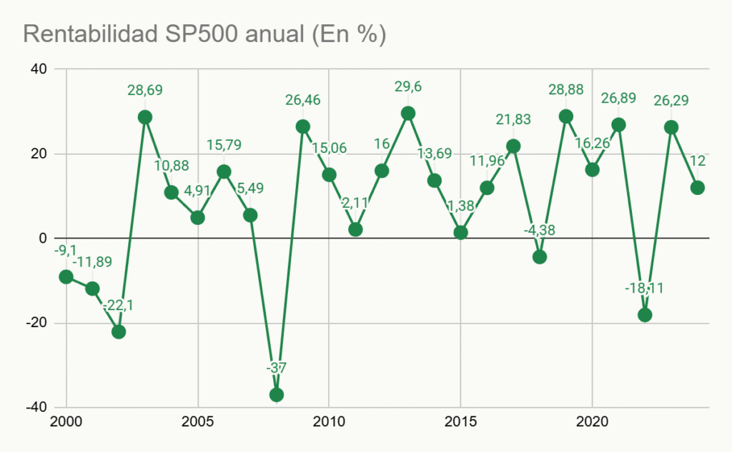 Un ejemplo del a rentabilidad del SP500 en los últimos años 20 años. Se puede ver que ha llegado a obtener algunos años rentabilidades cercanas al 30 y algunos años puntuales rentabilidades negativas o cercanas al cero, es una cuestión de que la media a largo plazo siempre ha sido positiva y cercana al 9% de rentabilidad.